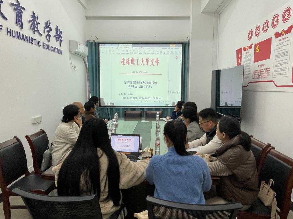 活动分为“警示教育”与“制度学习”两大环节。首先,集中观看中央纪委监委网站推出的警示教育片《反腐为了人民》,通过典型案例剖析,强化党员“不敢腐”的震慑,推动“知敬畏、存戒惧”的思想自觉。随后,组织学习《桂林理工大学教职工处分管理办法(试行)》,重点解读处分种类、适用情形、权限和程序等核心条款,强化制度约束。